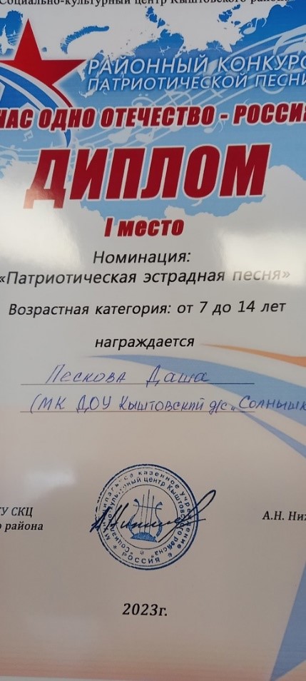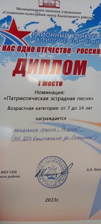 Вокальная группа "Радуга" приняли участие в районном конкурсе патриотической песни "У нас одно отечество - Россия ". В номинации "Патриотическая эстрадная песня" заняли 1 место.
